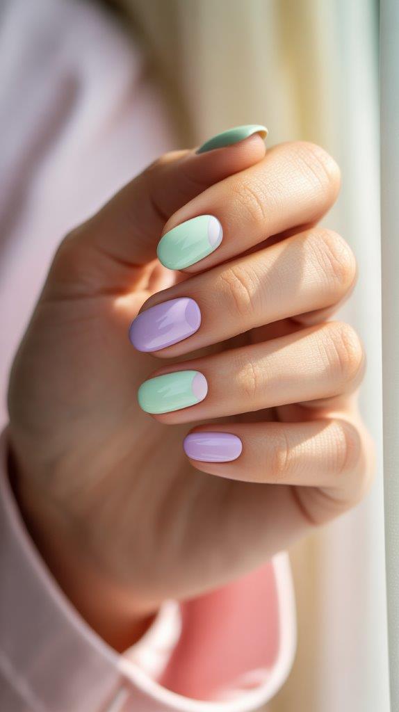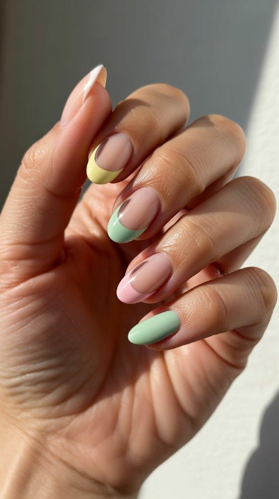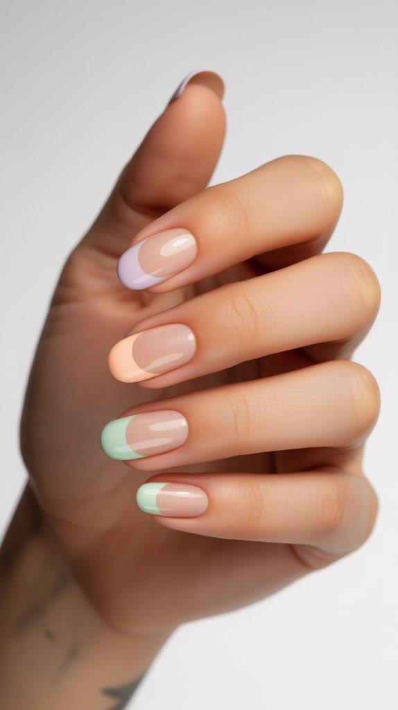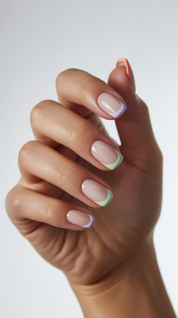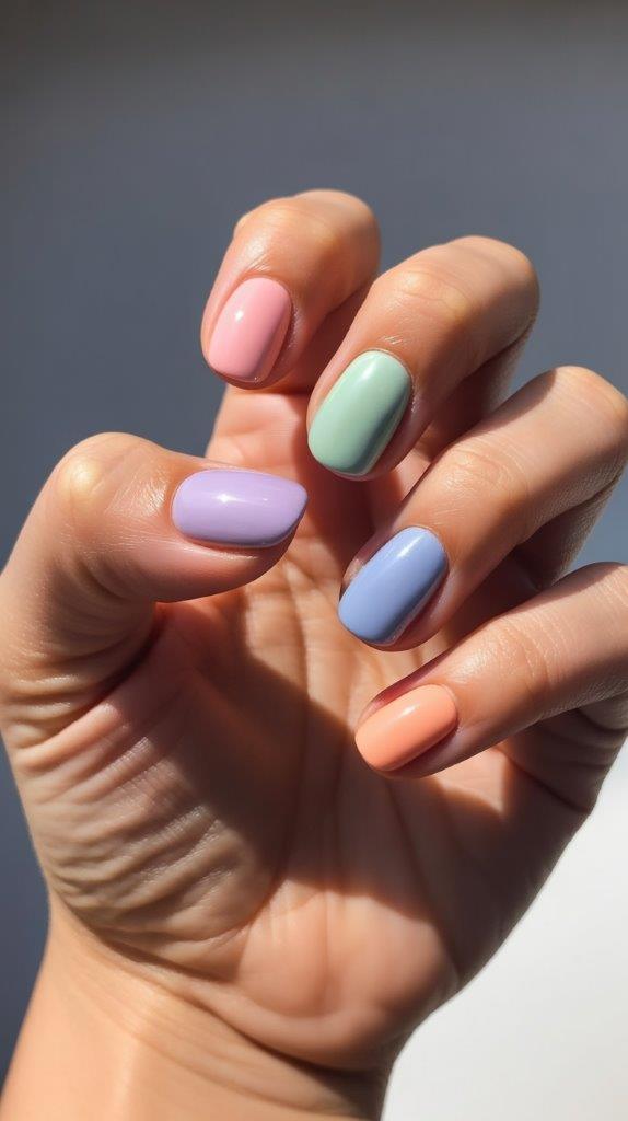 Each nail in a different soft pastel—pink, lavender, mint, blue, peach. On short nails, this looks playful and cohesive rather than chaotic. The rainbow effect works because the short length keeps it from being overwhelming.