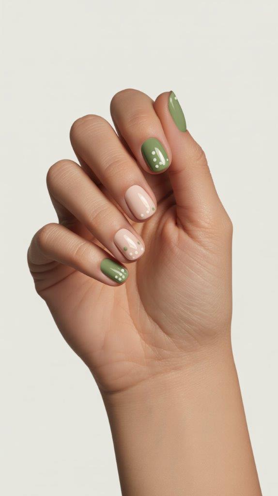 Solid spring color with 2-3 tiny dots near the cuticle in white or complementary shades. Small details work perfectly on short nails—they add interest without overwhelming the limited space. The restraint is what makes it elegant.