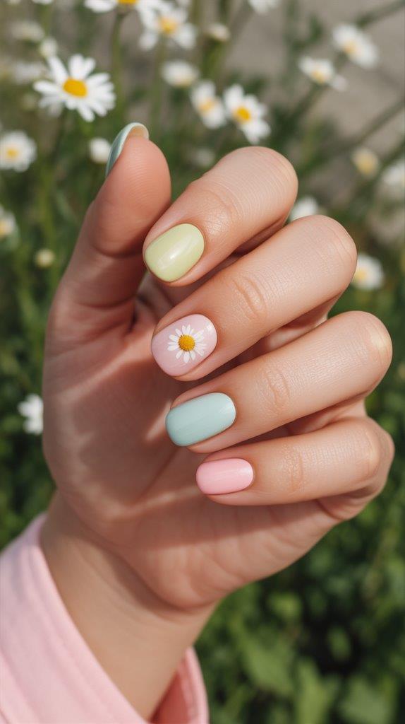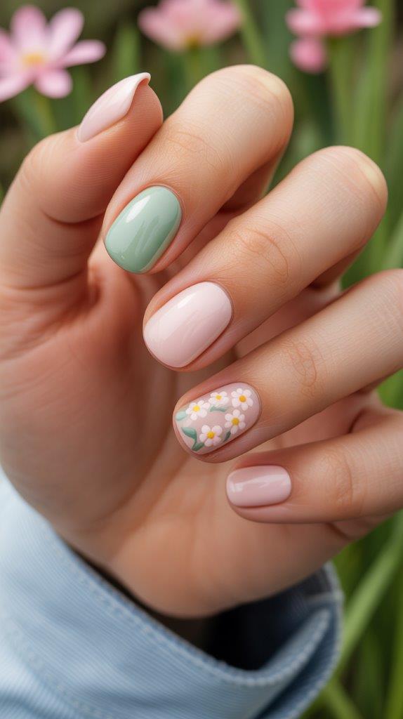 One tiny white daisy on a single accent nail with other nails in pastel solids. Keep florals small on short nails—one delicate flower is adorable, while multiple blooms can look crowded. Less is definitely more here.
