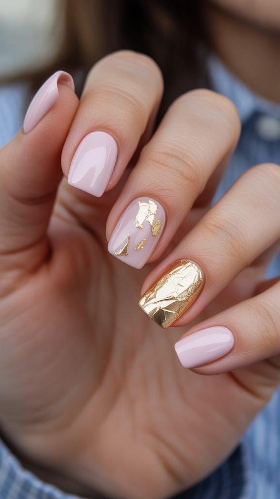 Spring pastel base with small pieces of gold foil on one or two accent nails. The foil adds texture and luxury without needing lots of space. This works brilliantly on short nails because foil creates impact through texture rather than size.