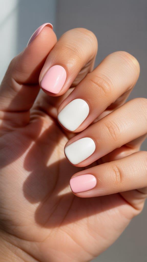 Alternate between baby pink and crisp white nails. The high contrast keeps things interesting, and both colors work beautifully on short lengths. This combination feels fresh and very spring-appropriate.