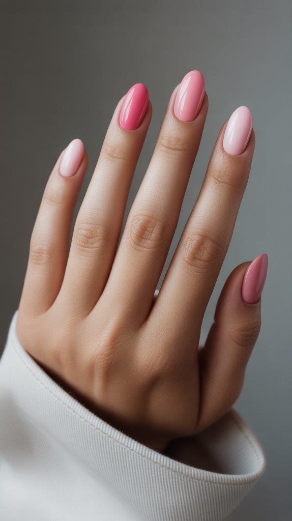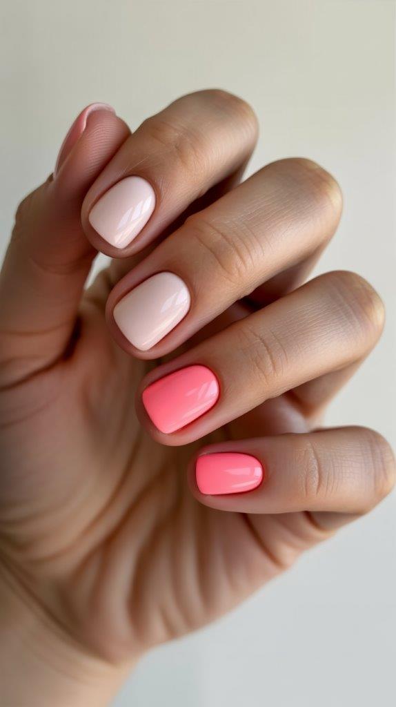 Light pink on most nails with a deeper pink on accent nails creates tonal interest. The monochromatic approach is sophisticated, and short nails carry it beautifully without looking boring.