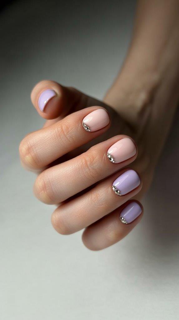 Soft pastel base with one tiny crystal near the cuticle on each nail or just accent nails. The single stone adds sparkle without overwhelming short nails. Restraint is key—one stone is elegant, multiple can look cluttered on short lengths.