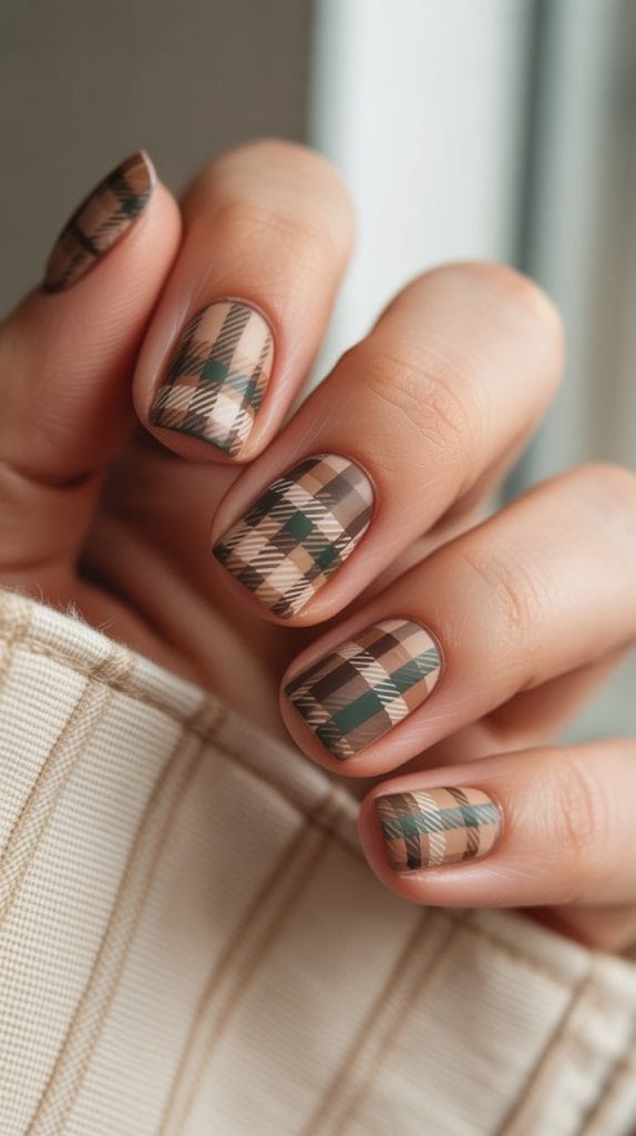 Bring a touch of rustic charm to your nails with plaid patterns. Use earthy tones like brown, green, and beige to create a cozy, homey look. This design is perfect for those who love the traditional Thanksgiving aesthetic.
