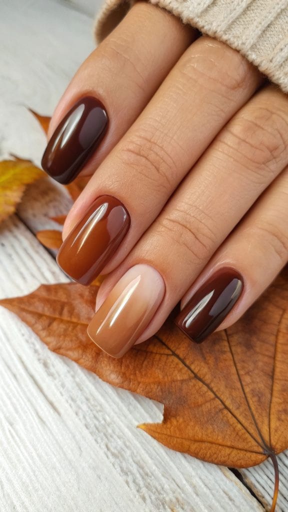 Embrace the essence of fall with warm brown tones that mirror the color of fallen leaves. This look is simple yet sophisticated, using various shades of brown to create a seamless gradient across your nails. It’s perfect for those who love an earthy and natural vibe. Pair this with a cozy sweater, and you’re all set for a day of apple picking or a casual night out by the bonfire.