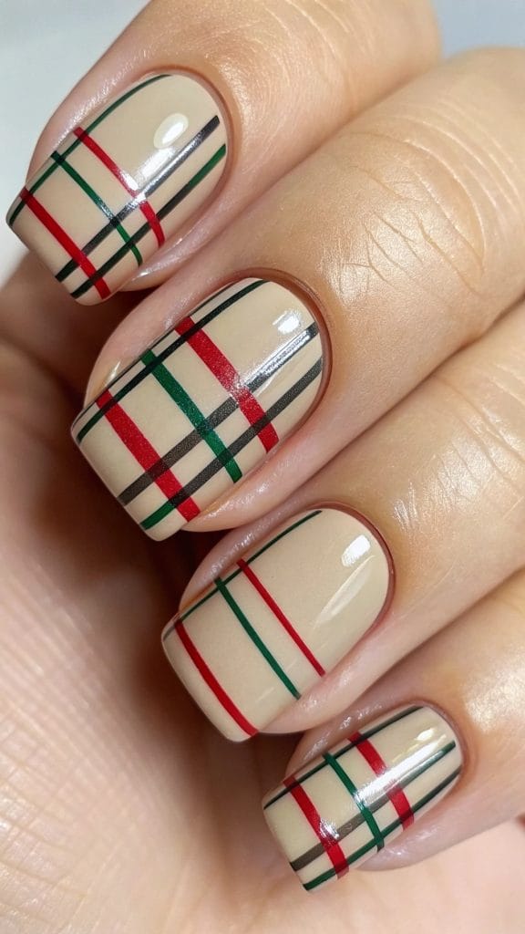 Plaid isn’t just for flannel shirts! Bring this classic pattern to your nails with a simple plaid design. Use a base color like beige or cream and add stripes of red, green, and black for that quintessential fall look. It’s a nod to the cozy patterns of the season and pairs perfectly with your favorite fall wardrobe staples.