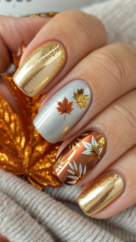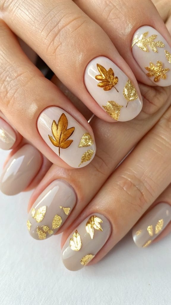 Add a touch of elegance to your nails with golden leaf accents. Start with a neutral base and gently place gold foil pieces on each nail. This design mimics the beauty of golden autumn leaves glistening in the sun. It’s a sophisticated choice for those looking to add a bit of shine and luxury to their fall nail game.