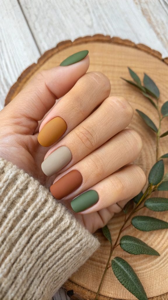 For a truly rustic look, combine different earth tones like ochre, taupe, and olive on your nails. This multi-toned design is reminiscent of a walk through the woods during fall. Each nail can feature a different shade, creating a harmonious and grounded aesthetic that celebrates the season’s natural beauty.