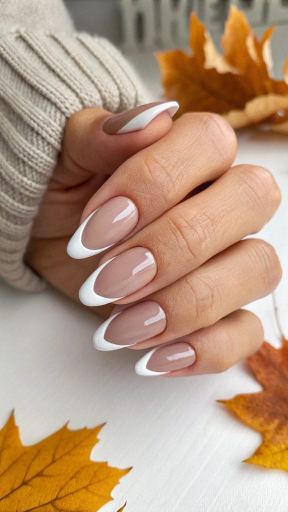 For a clean and classic look, opt for crisp white tips. This design is a modern twist on the traditional French manicure, with a fall-inspired touch. Keep the base neutral and add a sharp white tip for a fresh and contemporary feel. It’s a versatile choice that pairs well with any outfit and occasion.