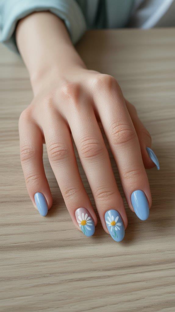 Full-nail floral stamps can be… a lot. Instead, opt for a single, tiny floral detail on one or two nails, leaving the rest in a solid complementary color. Picture a baby blue nail with one perfect, simple white daisy painted near the base. So cute, right?