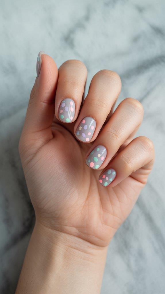 Polka dots are eternally cheerful. A neutral base (sheer nude, soft grey) with tiny dots in a spring palette scattered randomly is adorable. You can do monochromatic dots (white on beige) or multi-colored confetti dots.
