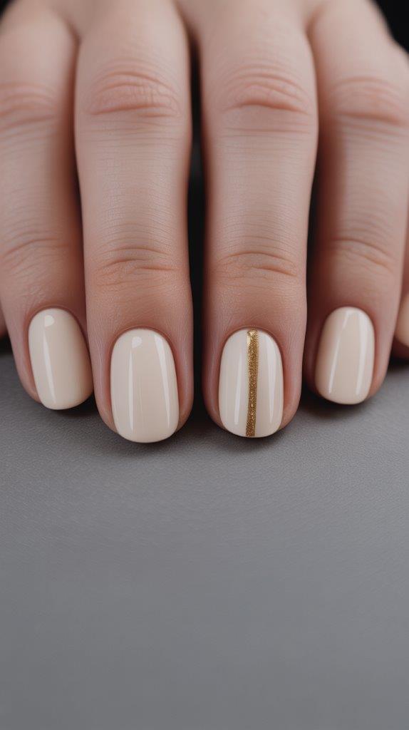 Paint all your nails a solid, creamy color (like a soft beige). Then, on your ring finger, use a thin brush or striping tape to paint a single, vertical line of metallic gold or silver down the center. It’s a minimalist detail that feels expensive and modern. Why complicate things?