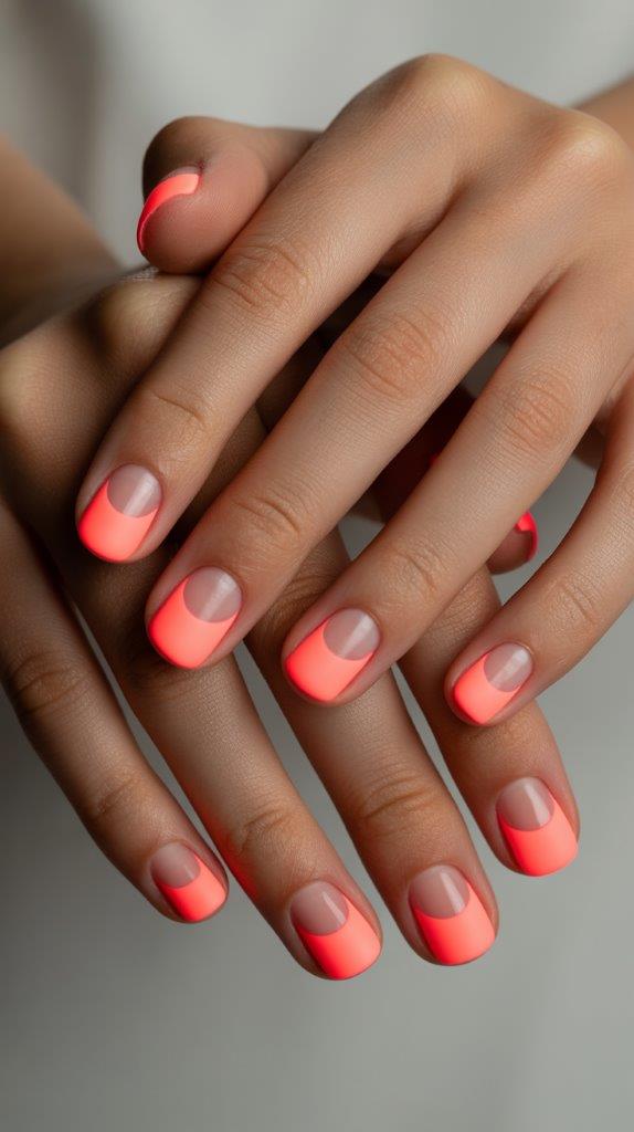 Let your natural nail shine through! Paint the bottom half of your nail (from the cuticle up) a bright spring color like coral or periwinkle. Leave the top half bare or with a clear coat. This geometric look is super trendy, and the negative space makes short nails look longer. IMO, it’s genius.