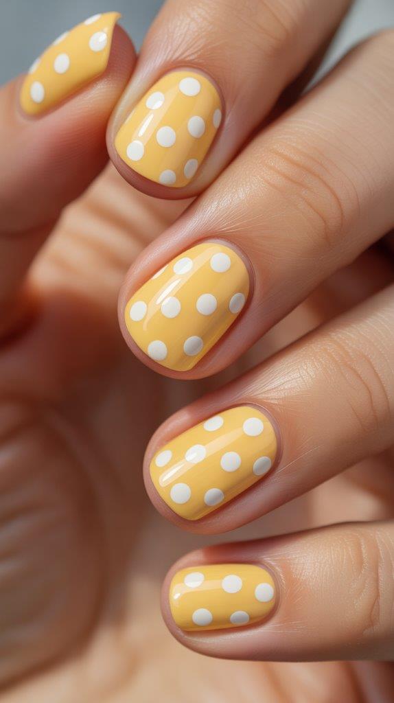 Channel some retro sweetness. Paint your nails a solid pastel yellow. Then, using a dotting tool or bobby pin, add neat, white polka dots. Keep the dots small and spaced out. It’s playful, timeless, and utterly cheerful. FYI, this design makes me crave lemonade every time.