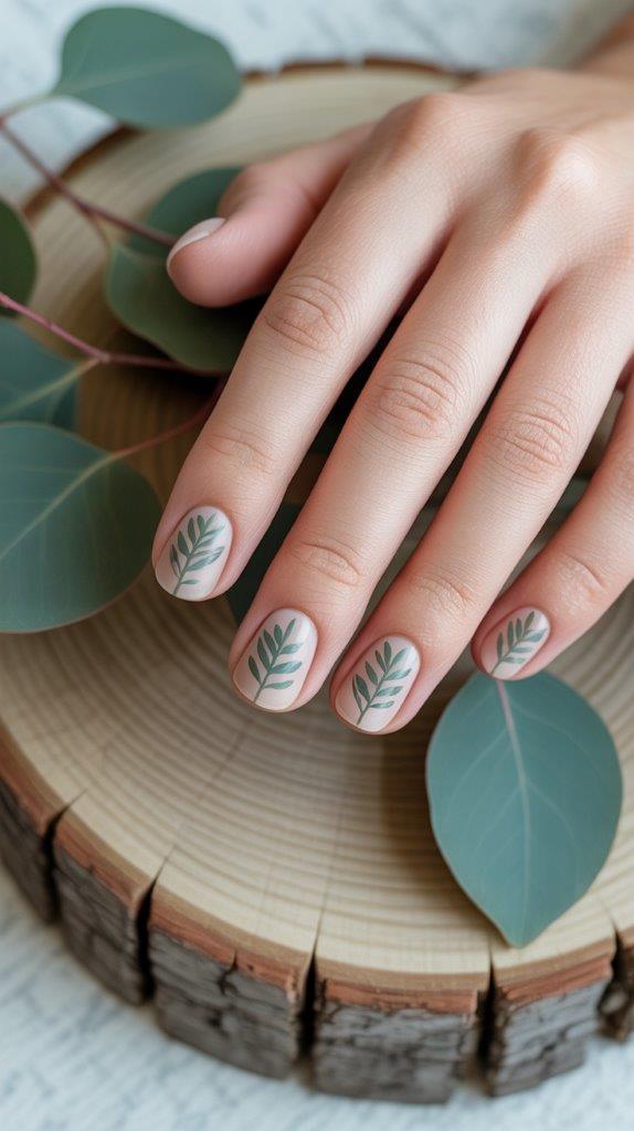 Spring in its simplest form. On a bare or nude nail, paint a single, elegant eucalyptus leaf shape in sage green. Use a thin brush and make it long and slender. One leaf per nail, placed slightly off-center. It’s botanical, peaceful, and incredibly classy.