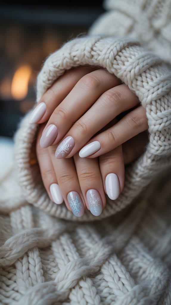 A soft white base with delicate snowflake art on one or two nails. It’s festive without looking like you raided the holiday aisle.