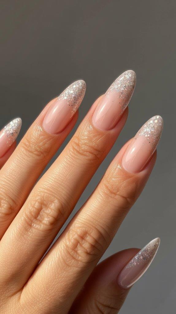 Start with clear or nude polish and fade glitter from the tips downward. Instant snow-dusted vibes.