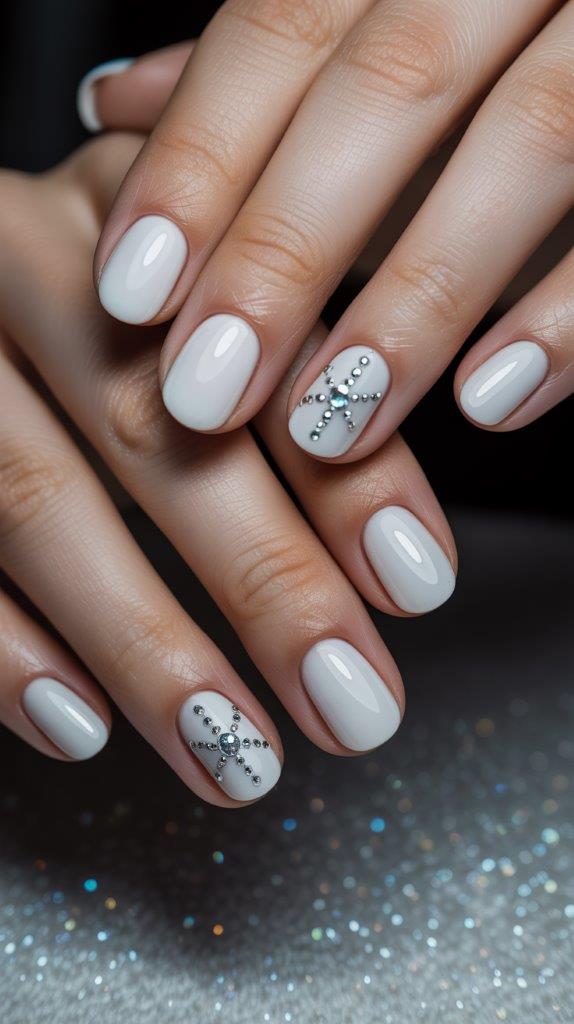 White nails decorated with small rhinestones arranged into snowflake patterns. Sparkly and glam without being tacky.