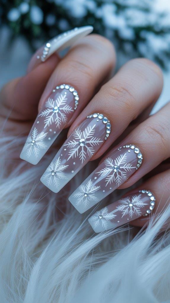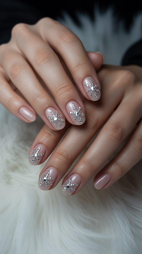 Nude bases with delicate snowflakes are subtle enough for everyday wear. They whisper “winter” instead of shouting it.