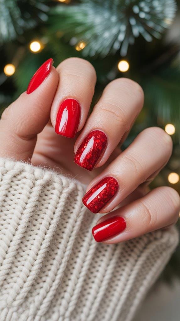 Red glitter nails = instant holiday cheer. Pair them with a mug of hot cocoa, and you’re golden.