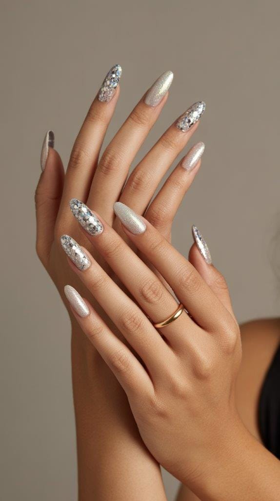 Combine chrome nails with glitter accents. It’s futuristic glam that looks expensive.