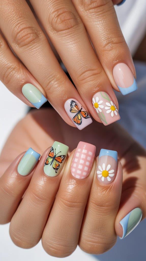 Go all out. Combine several elements: a pastel French tip on some nails, a floral accent on others, maybe a gingham nail and a butterfly nail. The key is keeping the color palette cohesive—stick to soft pinks, greens, yellows, and blues. This mismatched set tells a whole spring story across your ten fingers.