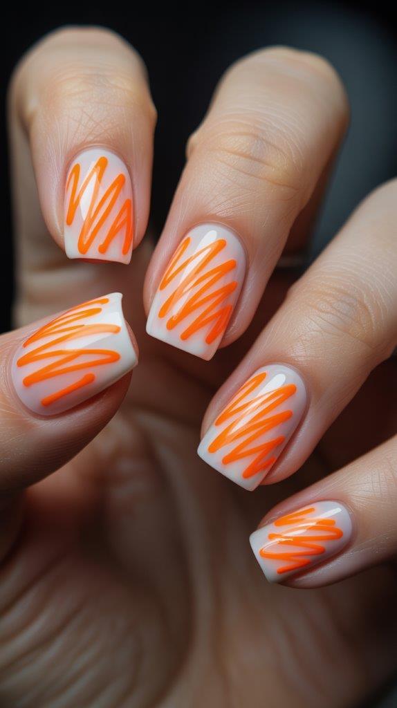 Ready for a statement? Paint your nails a stark, optical white. Then, take a thin brush and neon orange or green polish and just… scribble. Add a loose squiggle, a few chaotic lines, some dots. The messier, the better. It’s rebellious, artistic, and guaranteed to get a reaction. My attempt looked brilliantly unhinged in the best way.