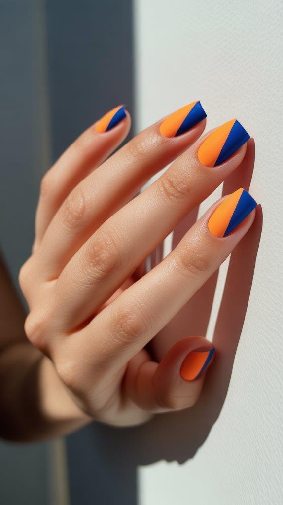 Leave part of your natural nail exposed in a clean, geometric shape—like a triangle cut from the corner or a stripe down the center. Fill the remaining space with a bold, solid color. It’s architectural, light, and seriously chic. It shows off a confident, modern aesthetic.
