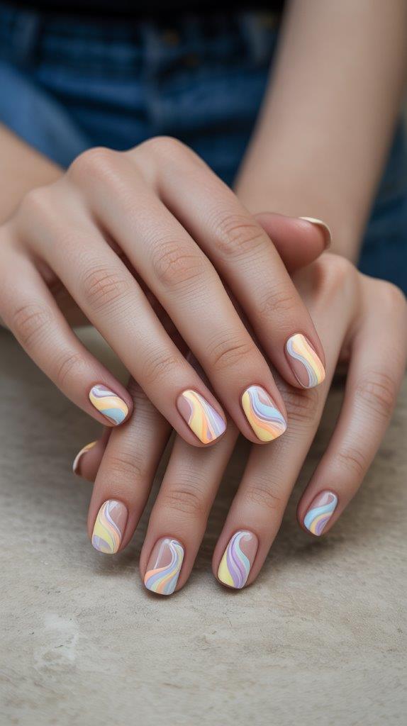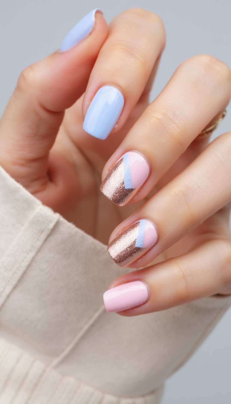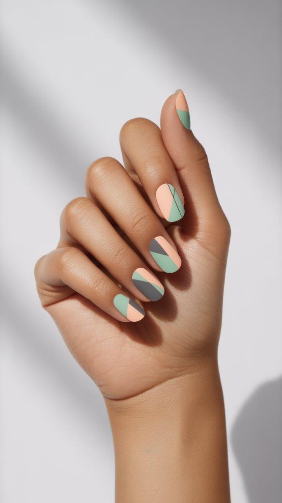 Clean lines and soft colors are a match made in heaven. This trend uses tape or fine brushes to create sharp shapes—think triangles, color blocks, or intersecting lines—in a palette of mint, peach, and gray. It’s a structured, modern take on spring nail art that feels incredibly fresh.
