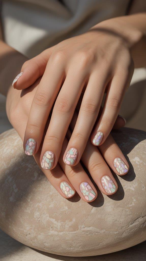 Yes, the countertop material made it to our nails, and it’s weirdly wonderful. This trend involves embedding tiny chips of color—think pastel flakes of pink, blue, and yellow—into a neutral base. It creates a speckled, textured look that’s full of depth and interest. It’s a work of art for your hands.