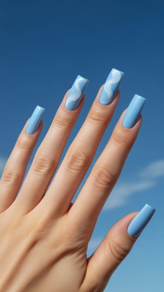 Pale blue nails instantly brighten your hands. Take it to dreamy levels by adding minimalist, wispy white clouds on one or two nails. The negative space of the square shape makes the sky feel even more expansive.