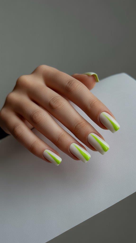 Think fresh stems and new leaves. Paint your nails a crisp, clean white. Then, using a thin brush, draw single, elegant chartreuse green lines from cuticle to tip on each nail. Vary the placement—some centered, some off to the side.