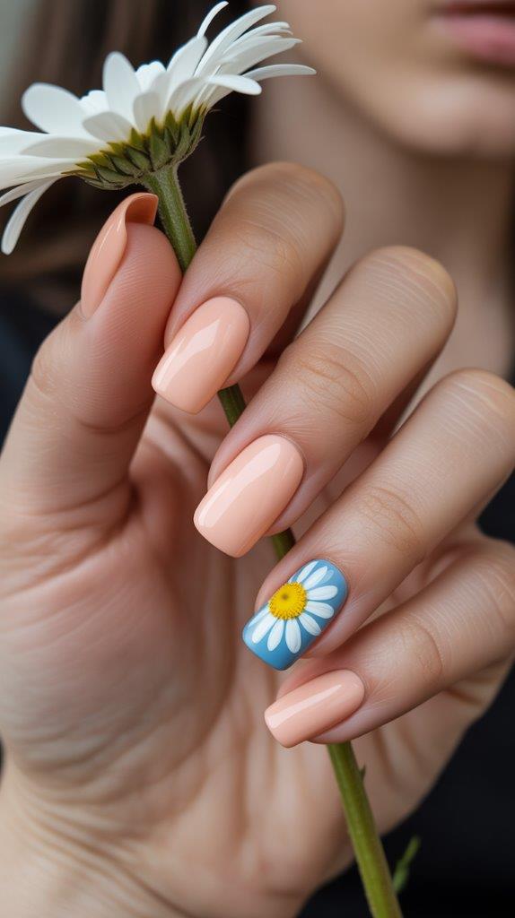 Commit to a full floral on all ten fingers? That can be a lot. Instead, paint most nails a solid pastel (like a soft peach). Then, choose one accent nail per hand for a single, perfectly detailed daisy or tulip. The long square shape acts like a perfect little portrait frame for your flower.