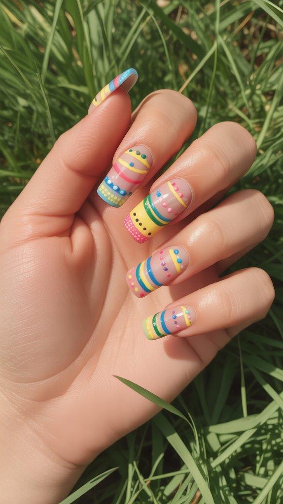 Embrace the fun! Use multiple soft colors to create tiny dots, stripes, and squiggles on each nail. The organized chaos is joyful, and the long square shape keeps it from looking messy. It’s basically wearing a spring festival on your hands.