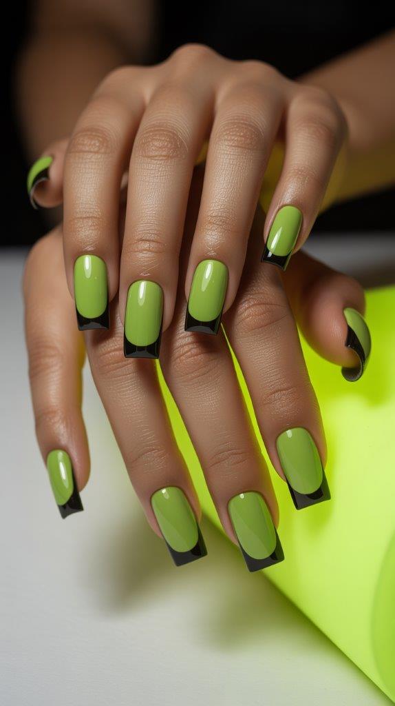 The lime is tropical and energetic, while the black adds edge and sophistication. Together, they create this fashion-forward look that works for both day and night. I love how the square tips make that color division super crisp and defined.