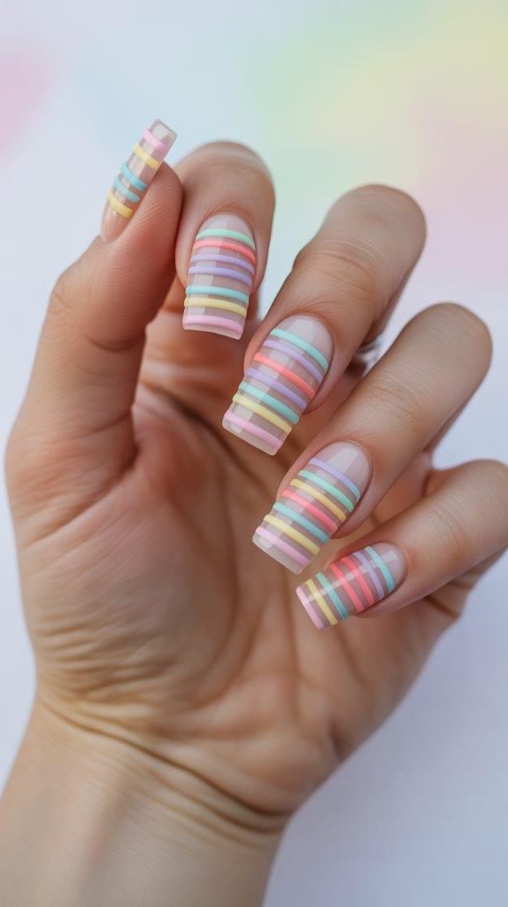 The thin stripes stacked on each nail give you rainbow vibes without being overwhelming. It’s like wearing summer candy, but make it sophisticated. The square shape provides perfect horizontal lines for the stripes to follow.
