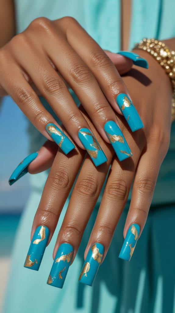 Tropical luxury alert: vibrant turquoise with scattered gold foil pieces. This combination screams expensive vacation and tropical glamour.