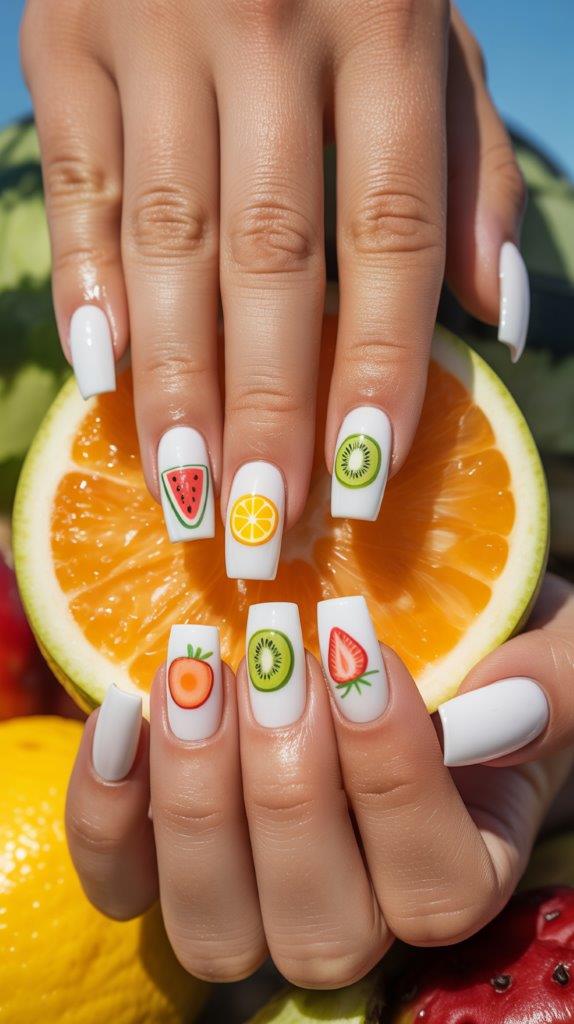 Playful and summery: white base with tiny painted watermelon, orange, lemon, and kiwi slices on accent nails. It’s like a fruit salad for your fingertips.