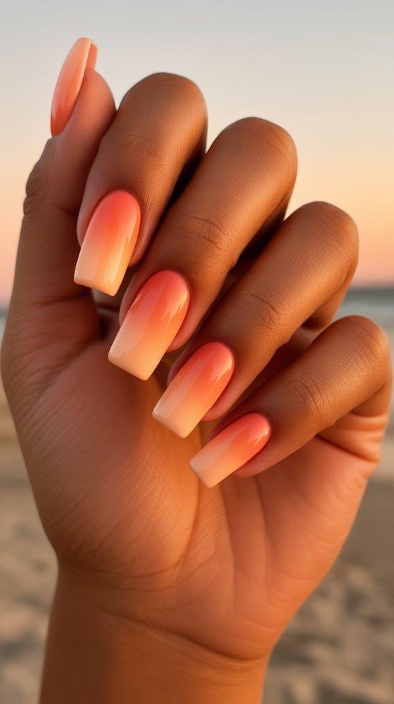 Romantic and warm: coral gradient fading from deep coral-orange to soft peach. This design is basically a sunset on every nail.