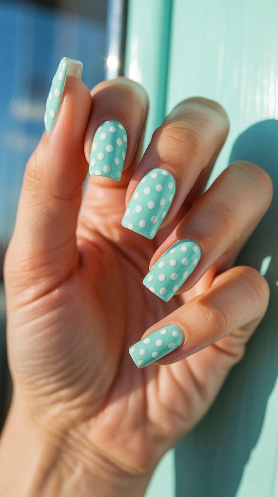 Retro and sweet: mint green base with evenly spaced white polka dots. This design channels serious 1950s diner vibes in the best way.