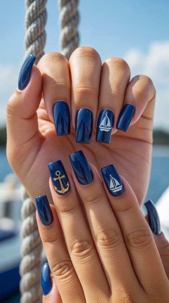 Classic nautical vibes: deep navy base with white or gold anchors on accent nails. This design is preppy, coastal, and timeless.