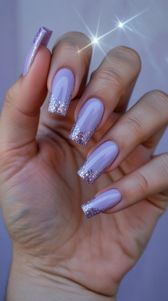 Dreamy and glamorous: soft lavender base with silver glitter fading from the tips. This combination is fairy tale meets summer evening.