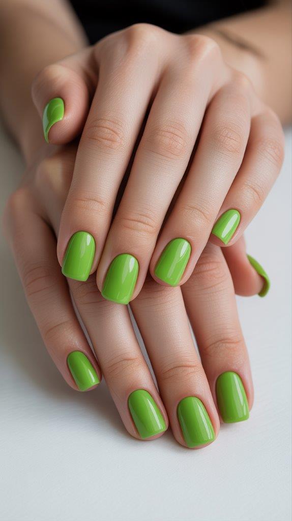 Medium-length square nails in bright, almost neon lime green. The bold color looks incredible against the clean square edges—the shape makes even aggressive colors look intentional and chic. This is spring energy at maximum volume, perfect for people who aren’t afraid of attention.