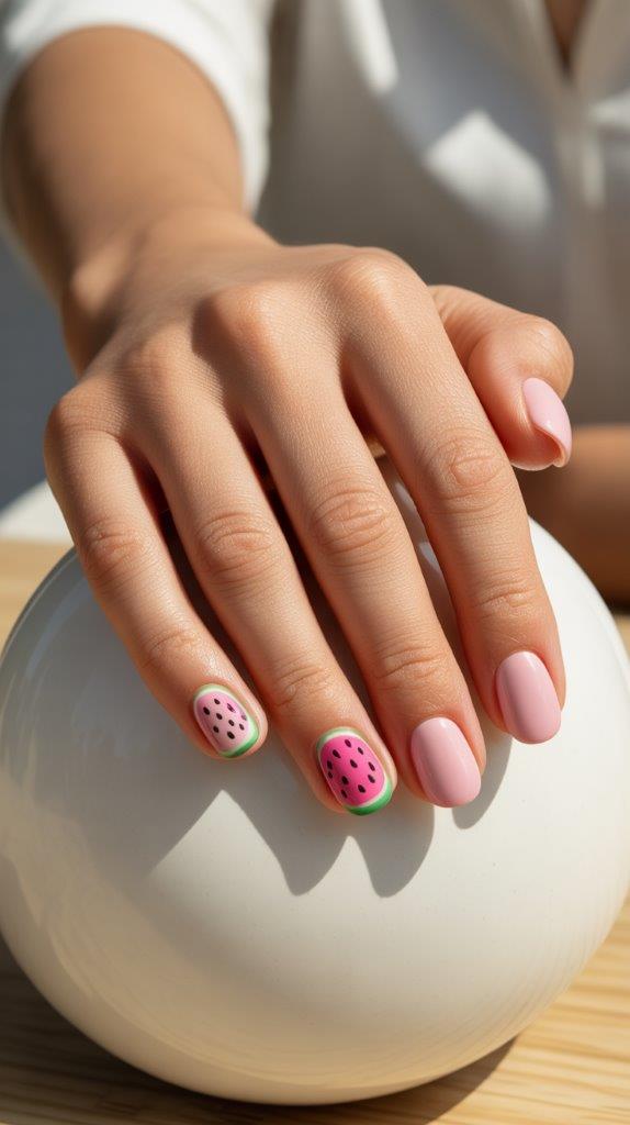 Is it even summer without a little fruit inspiration? Adorn one or two accent nails with tiny, hand-painted watermelon slices on a soft pink or white base. It’s whimsical, adorable, and just the right amount of playful. This design proves that summer almond nails can be both sophisticated and fun. Trust me, you’ll get compliments all season long.