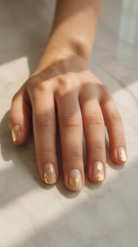 Apply delicate pieces of gold leaf or foil to a nude or clear base for a look that’s subtly opulent. The irregular shapes of the foil catch the light beautifully. It’s like having little pieces of sunlight stuck to your nails. This design is effortlessly chic and perfect for a summer wedding or fancy brunch.