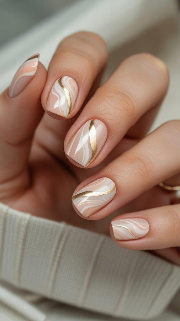 Picture the creamiest vanilla and the softest peach swirled together like Italian marble. Add a whisper-thin gold foil line along one edge of the swirl for a tiny, unexpected luxury. It’s a barely-there design that somehow gets everyone asking, “Where did you get your nails done?!”