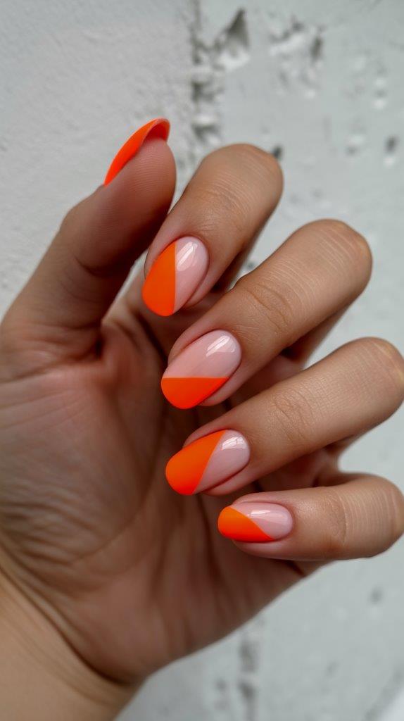 Leave parts of your natural nail exposed in sharp geometric shapes—triangles, lines, squares. Fill the rest with a bold color like tangerine or fuchsia. The contrast between your nail and the bright BIAB is what makes this design so striking and modern.