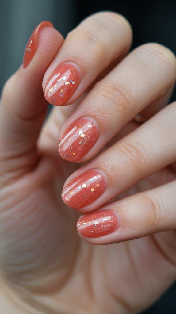 A “jelly” BIAB is a translucent, squishy-looking color. Ask for a coral jelly base with scattered, tiny iridescent glitter flakes suspended inside. It looks like you captured a fizzy summer drink in nail form. Refreshing 🙂