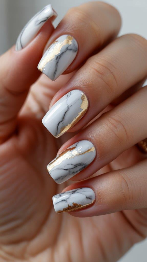 A grey or white marble effect created with swirling veins, then accented with delicate flakes of real gold leaf. It looks expensive, organic, and incredibly sophisticated. It’s art you wear.