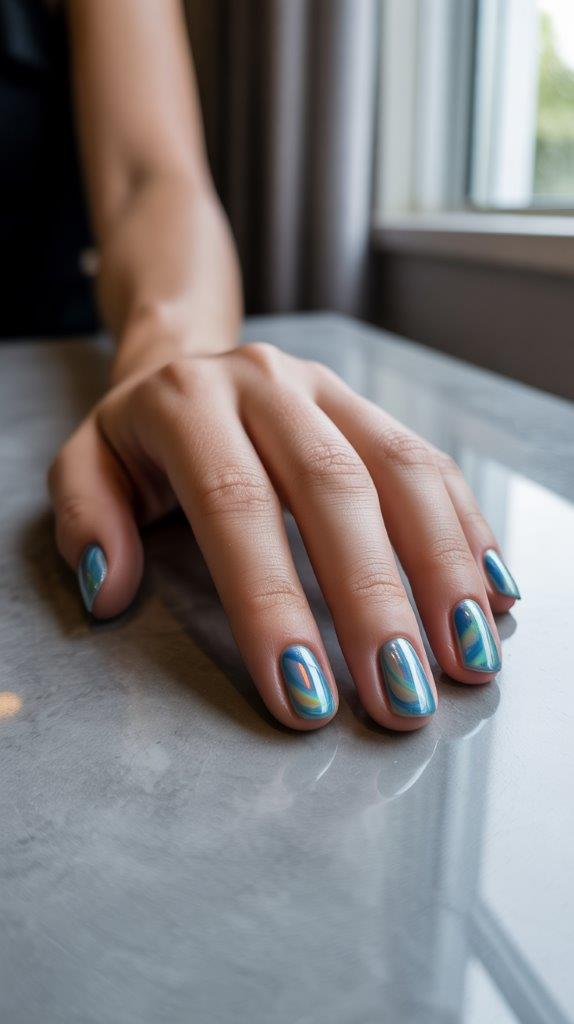 Mirror-like chrome in shades like blue, purple, or green. The high-shine finish reflects everything, making your nails the center of attention. Apply it over a colored base for a custom, dimensional look. Just be prepared for everyone to ask, “How did you do that?”
